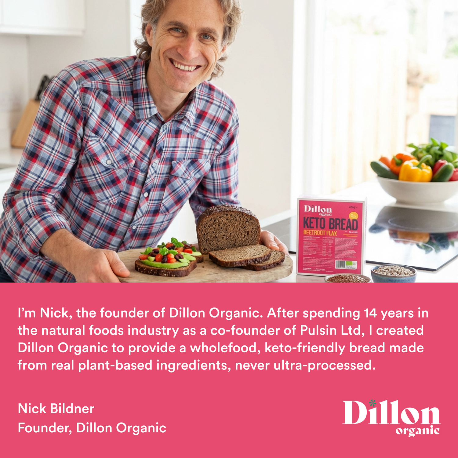 This is our Beetroot Flax Organic Keto bread made with a blend of beetroot, flax, sunflower seeds, and caraway seeds for flavour. It comes as an unsliced half loaf and that gives you the freedom to choose which thickness you'd like to make your slice. Great toasted or double toasted and made into an open sandwich. It is delicious tasting bread that helps keep you fuller for longer, and replaces the need to reach for a high carb loaf with a healthy, keto based alternative.